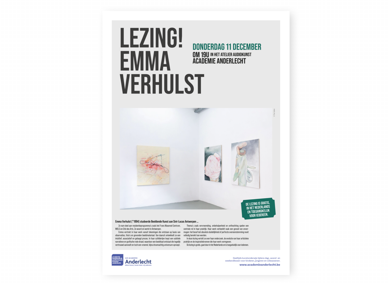 Op donderdag 11 december om 19u komt schilder Emma Verhulst spreken over haar werk in het atelier Audiokunst. Ze nam eerder deel aan residentieprogramma’s zoals het Frans Masereel Centrum, WIELS en Cité des Arts. Ze woont en werkt in Antwerpen.