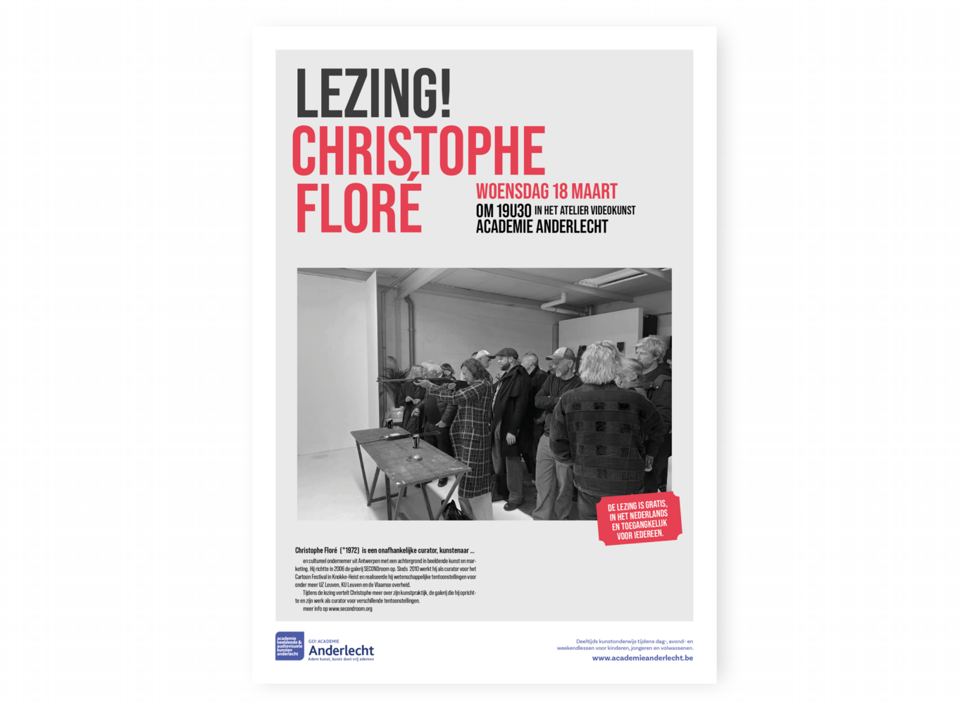 Op woensdag 18 maart om 19u30 komt kunstenaar en curator Christophe Floré een lezing geven over zijn kunstpraktijk, de galerij die hij oprichtte en zijn werk als curator voor verschillende tentoonstellingen.